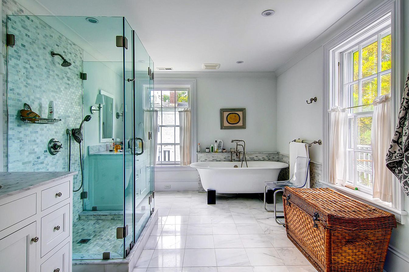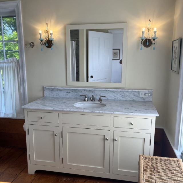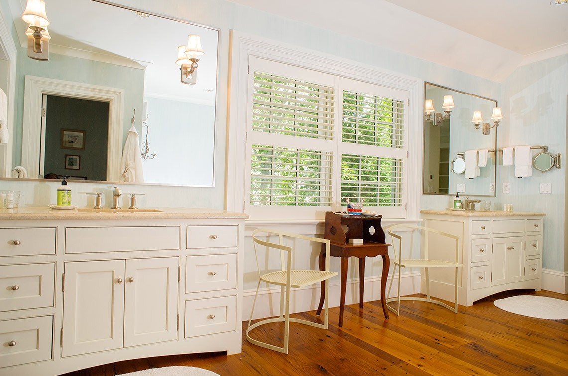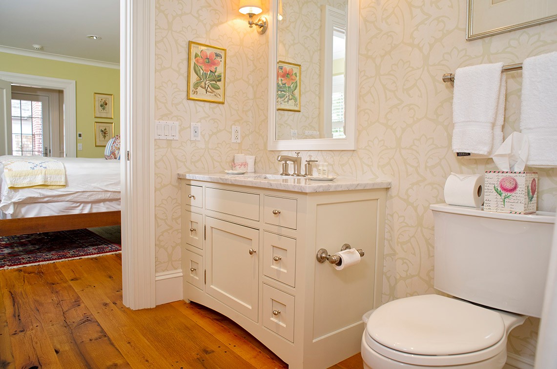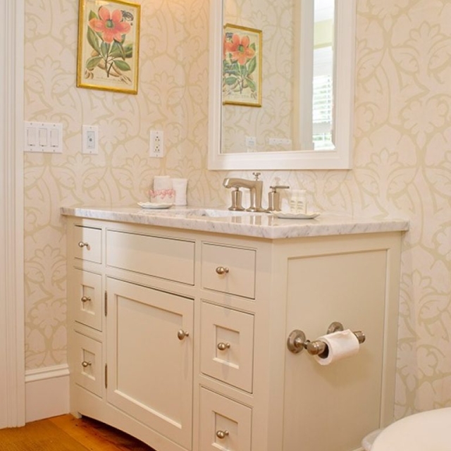 As a bathroom designer, my favorite is to compose a bathroom of a variety of textures using white materials: small wall tiles, large floor tiles, white cabinets, and window treatments. Then, if you choose, you can bring color into the room with your choice of towels, shower curtain fabric (unless glass enclosures are used) and possibly wallpaper – which is seldom done on Martha’s Vineyard but, I believe, should be considered.