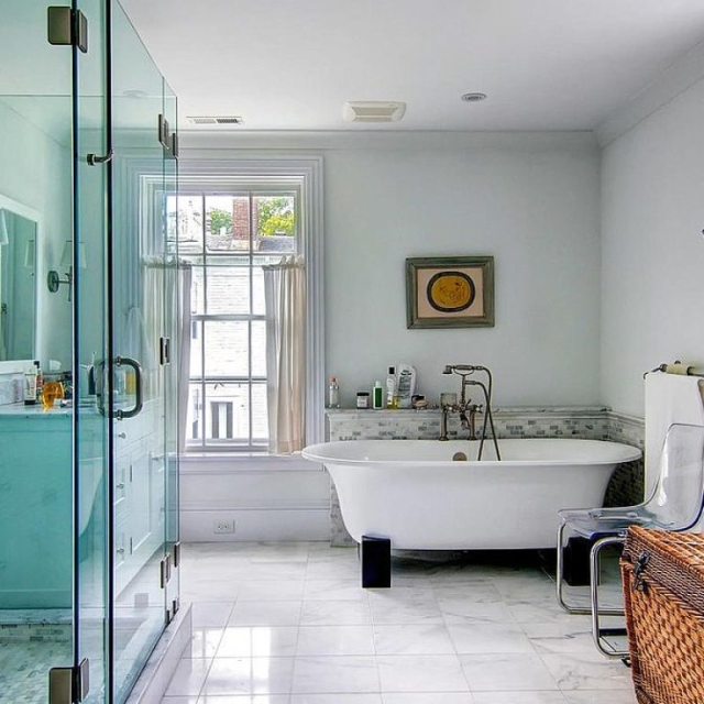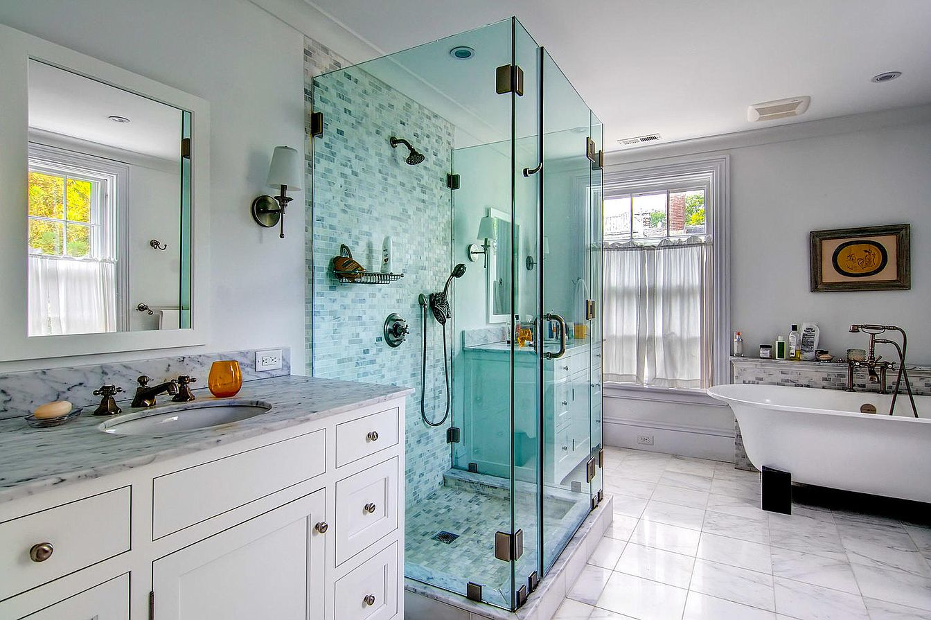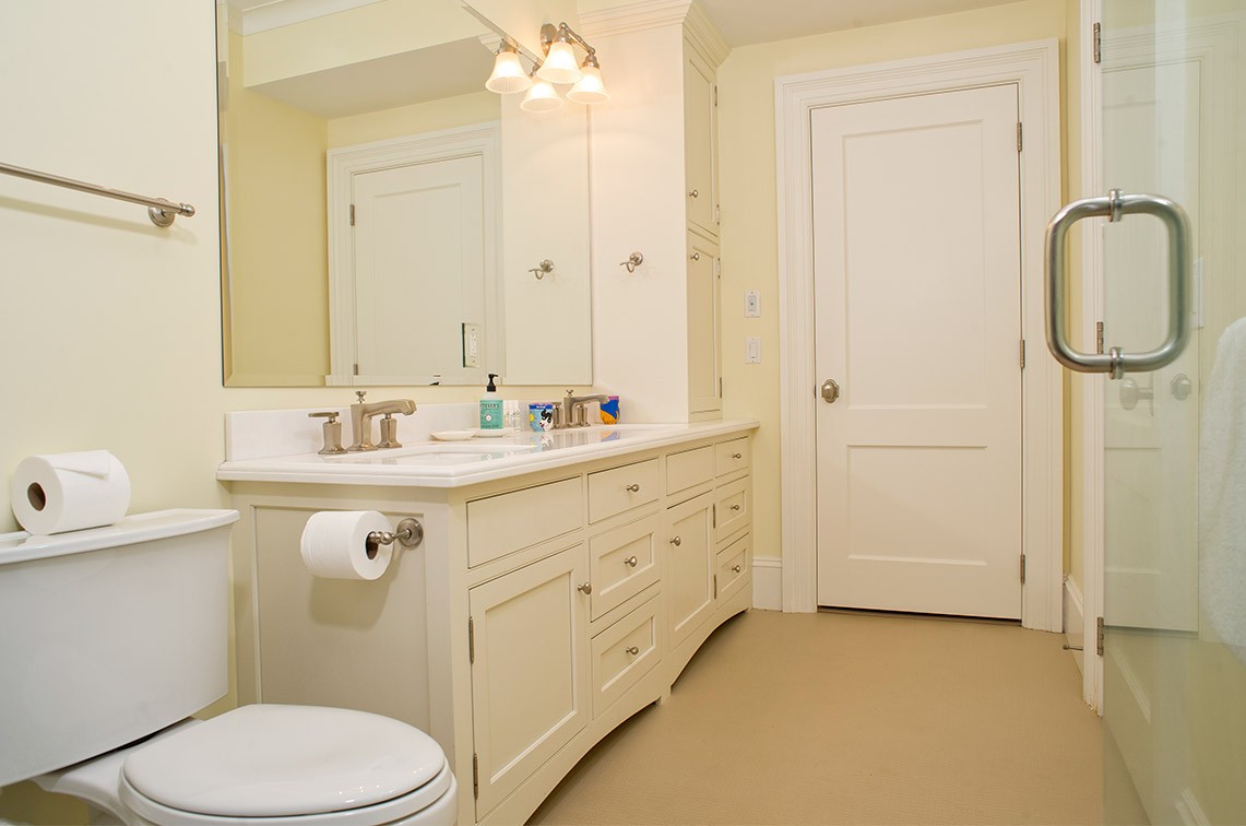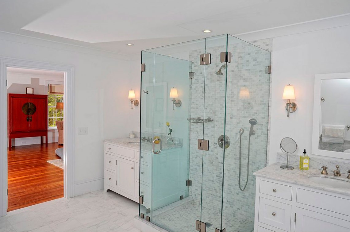 As a bathroom designer, my favorite is to compose a bathroom of a variety of textures using white materials: small wall tiles, large floor tiles, white cabinets, and window treatments. Then, if you choose, you can bring color into the room with your choice of towels, shower curtain fabric (unless glass enclosures are used) and possibly wallpaper – which is seldom done on Martha’s Vineyard but, I believe, should be considered.